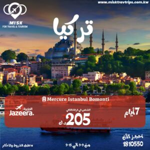 كل هذه التجربة السياحية الفاخرة متاحة بسعر استثنائي يبلغ فقط 205 دينار كويتي للشخص الواحد في غرفة ثنائية. السعر يشمل الإقامة في فندق Mercure Istanbul Bomonti مع خدماته الراقية، إلى جانب تذاكر الطيران ذهابًا وإيابًا، مما يجعل العرض فرصة نادرة لا تعوض لعشاق السفر. في هذا العرض ستحصل على قيمة عالية مقابل ما تدفعه، حيث تجمع بين الراحة، الجودة، والتنظيم الاحترافي. والأجمل أن توقيت الرحلة في شهر سبتمبر مثالي للاستمتاع بمناخ معتدل بعيدًا عن حرارة الصيف، ما يمنحك فرصة ذهبية للاستكشاف والتسوق وقضاء أوقات مميزة وجميلة في تركيا.